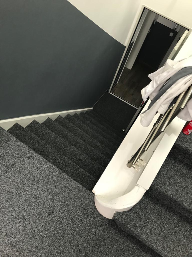 Die Treppenanlage wurde mit dem Schweizer Bodenbelag Fabromont Kugelgarn vollflächig (Podeste und Stufen) ausgelegt.