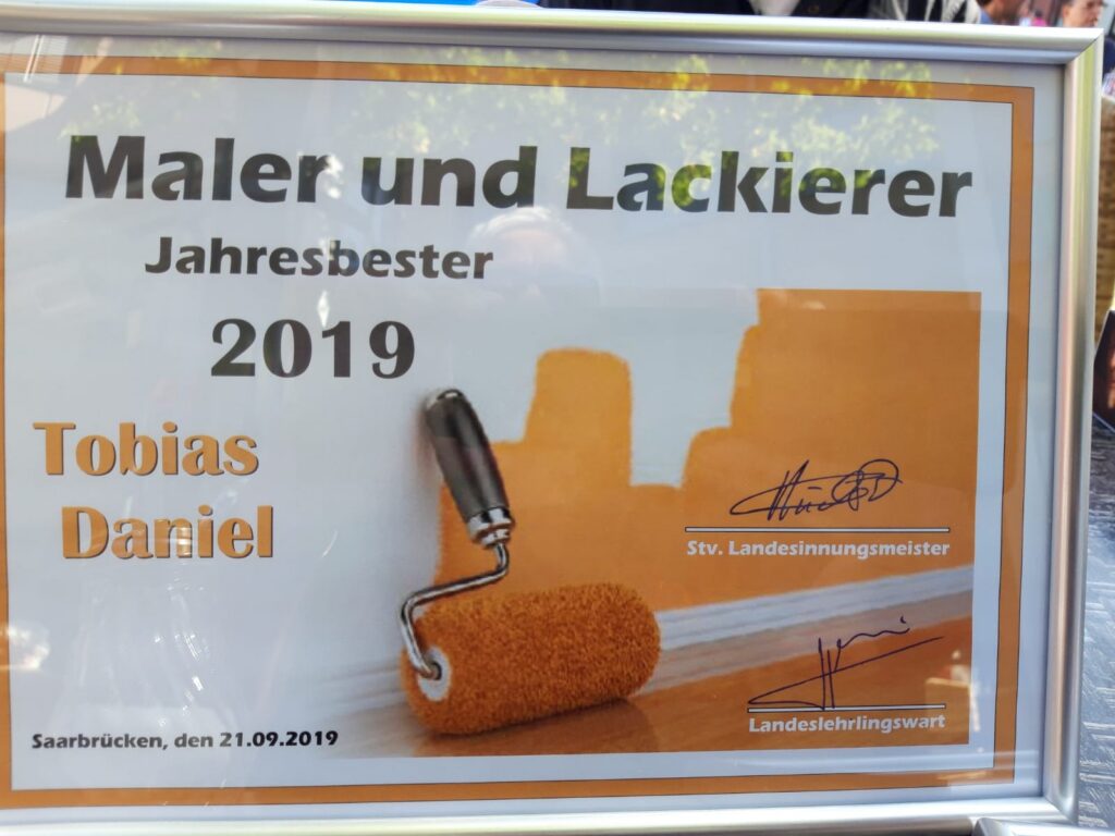 Unser Auszubildender, Tobias Daniel, hat als Jahres-bester die Gesellenprüfung zum Maler und Lackierer bestanden, wofür wir ihm hiermit erneut gratulieren möchten. Mit dieser ausgezeichneten Leistung tritt er im Oktober bei der Bundesentscheidung an. Wir drücken ihm auch hierfür fest die Daumen.
