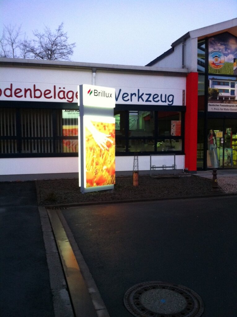 Um uns noch deutlicher zu unserem Hauptlieferanten zu bekennen, haben wir als Streckenhändler für Brillux eine neue Lichtreklame installiert.