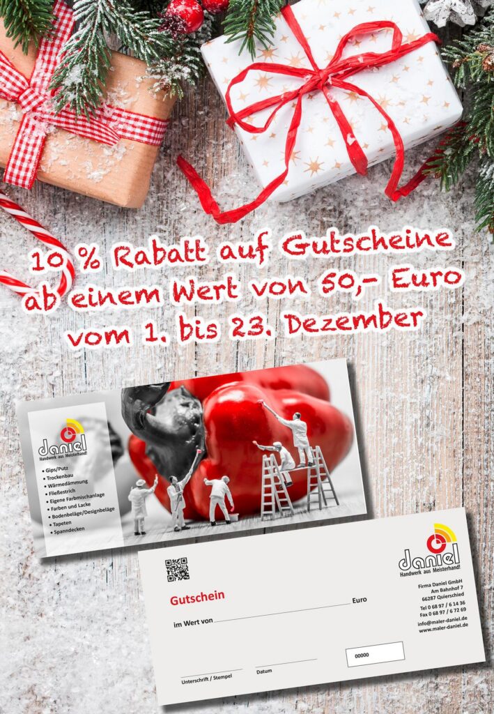 Als unser Geschenk an Sie, gewähren wir Ihnen ab einem Betrag von 50,- Euro in der Zeit vom 01.12.2017 – 23.12.2017 einen Rabatt in Höhe von 10 Prozent.